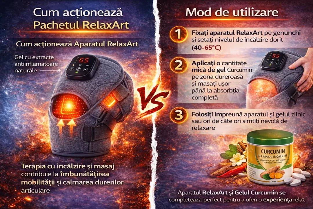 Aparatul de masaj RelaxArt acționează direct asupra zonei dureroase prin terapie cu încălzire și vibrații, contribuind la relaxarea musculaturii și la reducerea rigidității articulare.